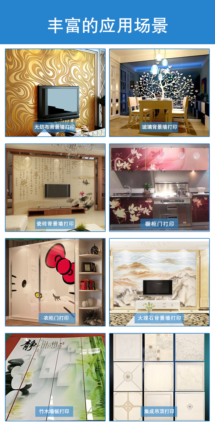 裝飾品、特制品都是專業(yè)的個性化市場,如藝術(shù)玻璃、裝飾陶瓷、木制工藝品、 家具、 假金屬板、 天花板、 窗簾等等, 這個市場的特點是手工加工的成分很高, 生產(chǎn)效率低, 短版業(yè)務(wù)多, 最適合采用數(shù)碼噴繪技術(shù)替代。 目前至少 30% 的平臺噴繪機(jī)應(yīng)用在獨特的個性化市場。