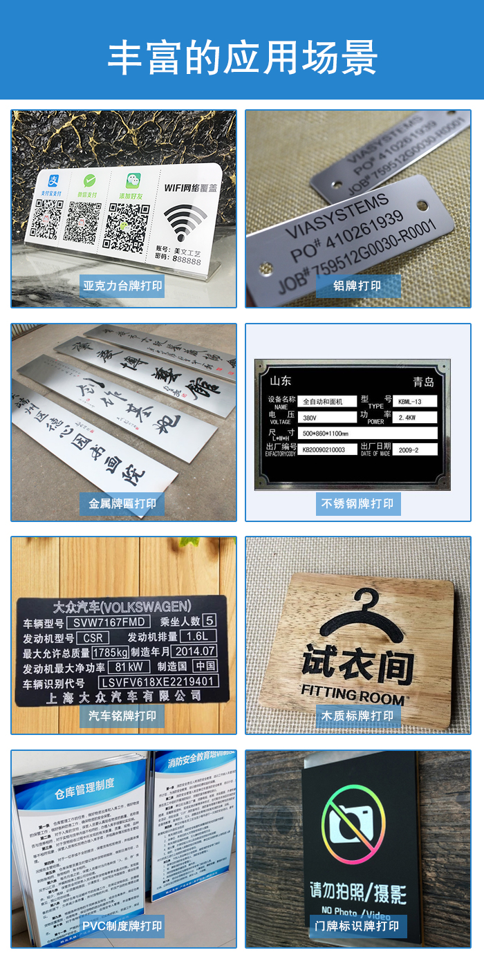 廣告、交通、電力等行業(yè)的硬質(zhì)標(biāo)牌制作也是平臺(tái)噴繪機(jī)的受益者, 使用 UV 墨水的平臺(tái)噴繪機(jī)可以直接噴繪到最終的標(biāo)牌材質(zhì)上,如金屬、反光膜、木頭、塑料等等,相對(duì)于傳統(tǒng)的網(wǎng)版印刷或噴繪在帶背膠的貼膜類材料上,然后再貼上去的做法,既減少了工序,降低了成本, 又增加了牢固程度。